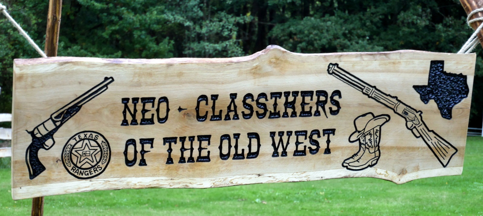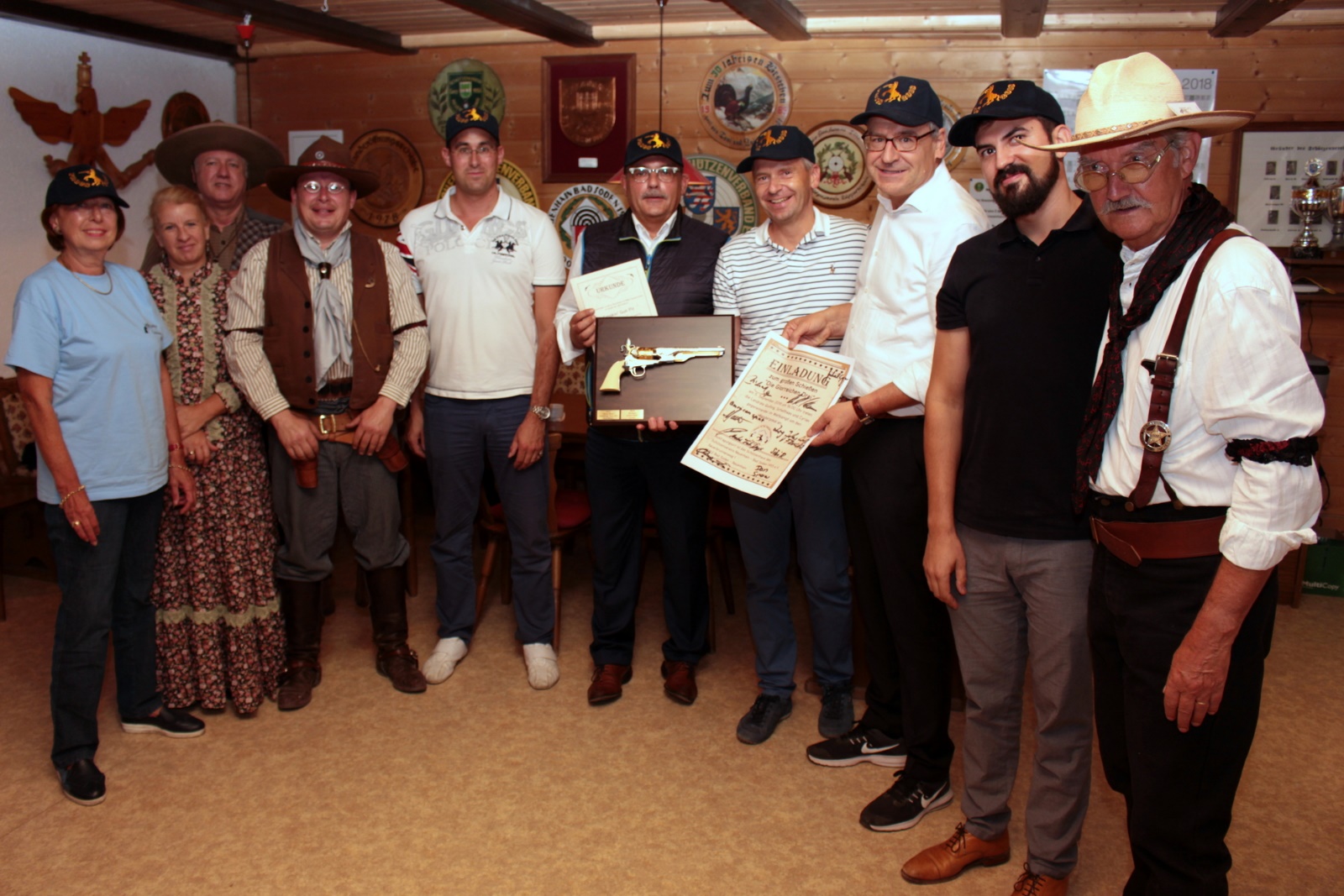 Our patrons, a handful of FROCS in cowboy outfit and folks of the Bad Soden shooting club after the 2018 match: Note the challenge trophy between Smokin’ Gun Pit and Chief Rub while Tall Rider holds the invitation poster