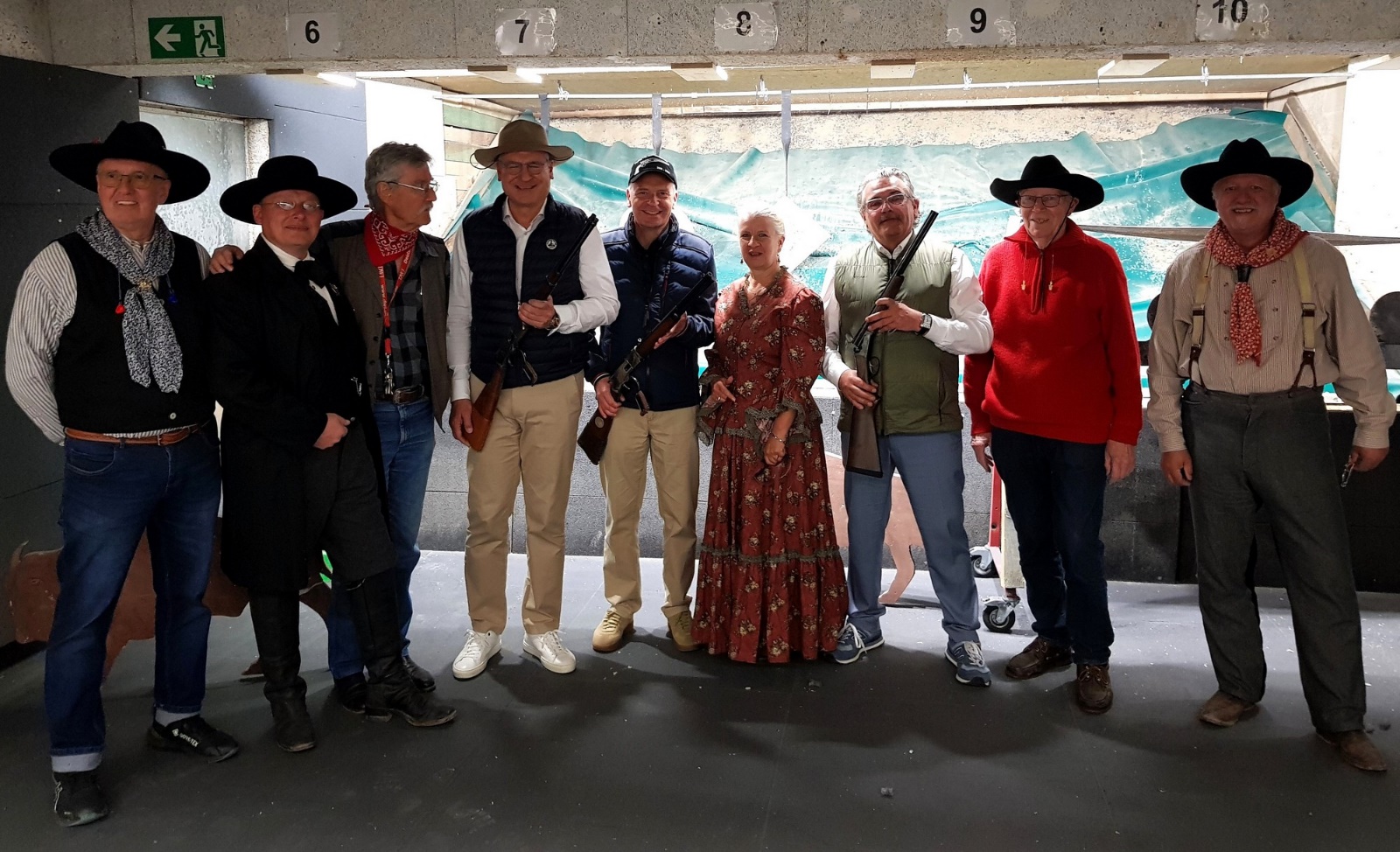 Trainers, supporters and contestants in 2024 (from left): Sigi Bechert (CAS trainer, Klein-Umstadt), Jörg Ullrich (CAS trainer, Hofheim), Wolf Niederastroth (yours truly, Hofheim), Oliver “Tall Rider” Quilling (patron Offenbach County District), Michael “Chief Rub” Cyriax (patron Main-Taunus-District), Kerstin Fink-Mayer (Hofheim), Klaus “Smokin’ Gun Pit” Schellhaas (patron Darmstadt-Dieburg District), Dieter Hummel (Hofheim), Michael Mayer (CAS trainer & match director, Hofheim)
