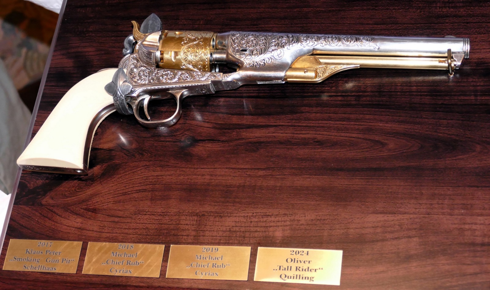 The challenge trophy with mounted non shooting Colt 1861 Navy: Note name plates of the first placed patrons